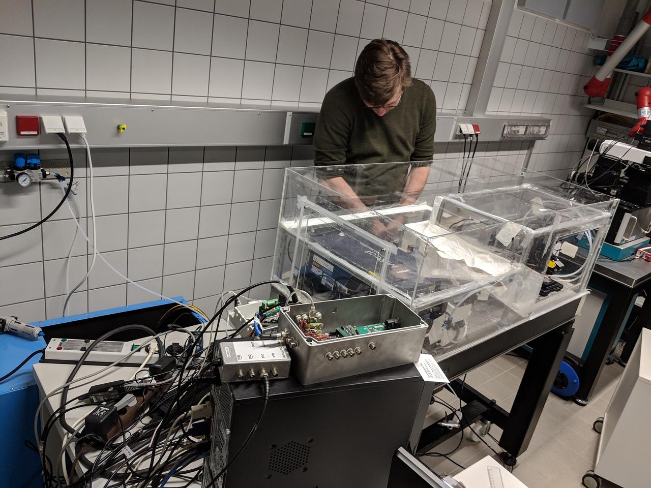 This is me holding our work horse AFM, the Keysight 5400. A decent AFM, not really all that optically accessible. One of the biggest advantages of this AFM was, that it was very flexible with an API that allowed to perform a lot of tasks programmatically and easy access to all datachannels of the instrument.